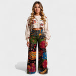 Izrađene od mekanih, laganih tkanina koje nježno prianjaju uz kožu, ove hlače nude prozračan, udoban kroj sa širokim nogavicama i visokim strukom za laskavu siluetu. Šareni boho uzorci daju zabavan retro izgled, dok elastičan pojas osigurava praktično i ugodno nošenje.